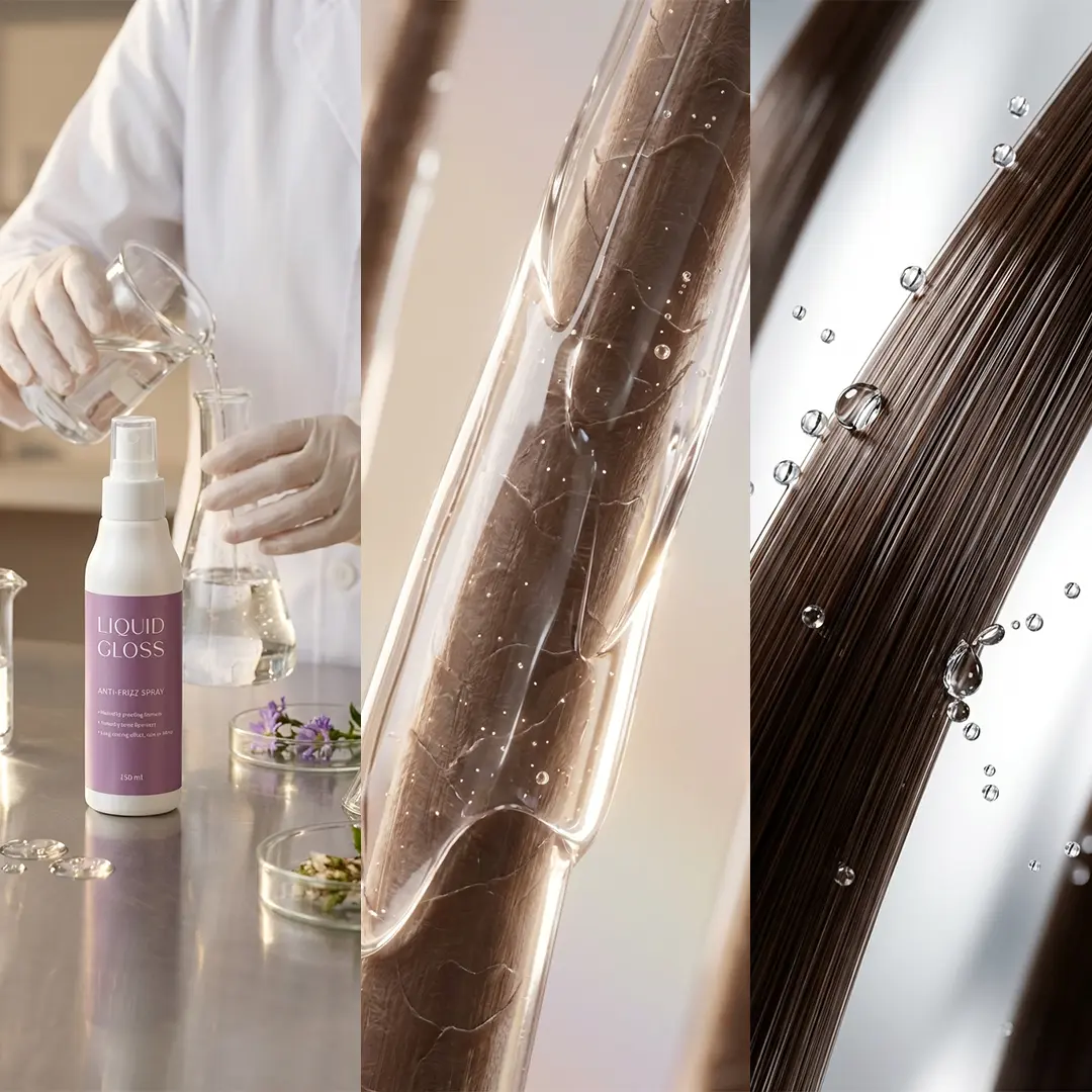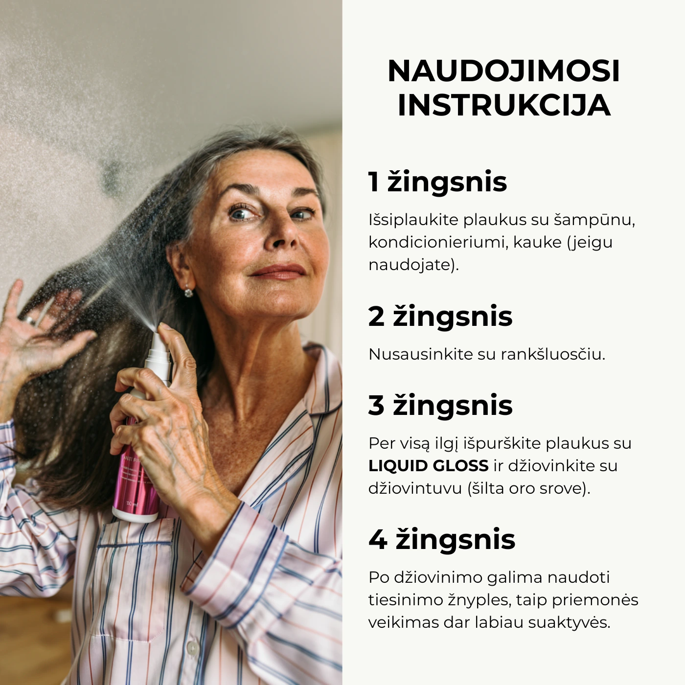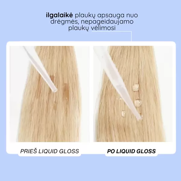 Specialistų komanda laboratorijoje sukūrė LIQUID GLOSS, kuris padengia plauką nematoma plėvele, kuri suteikia barjerą nuo pažeidimų, akimirksniu aktyvuoja plaukų spindesį.