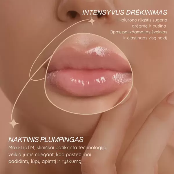 - Naktinė kaukė miego metu ypatingai intensyviai maitina lūpų odą