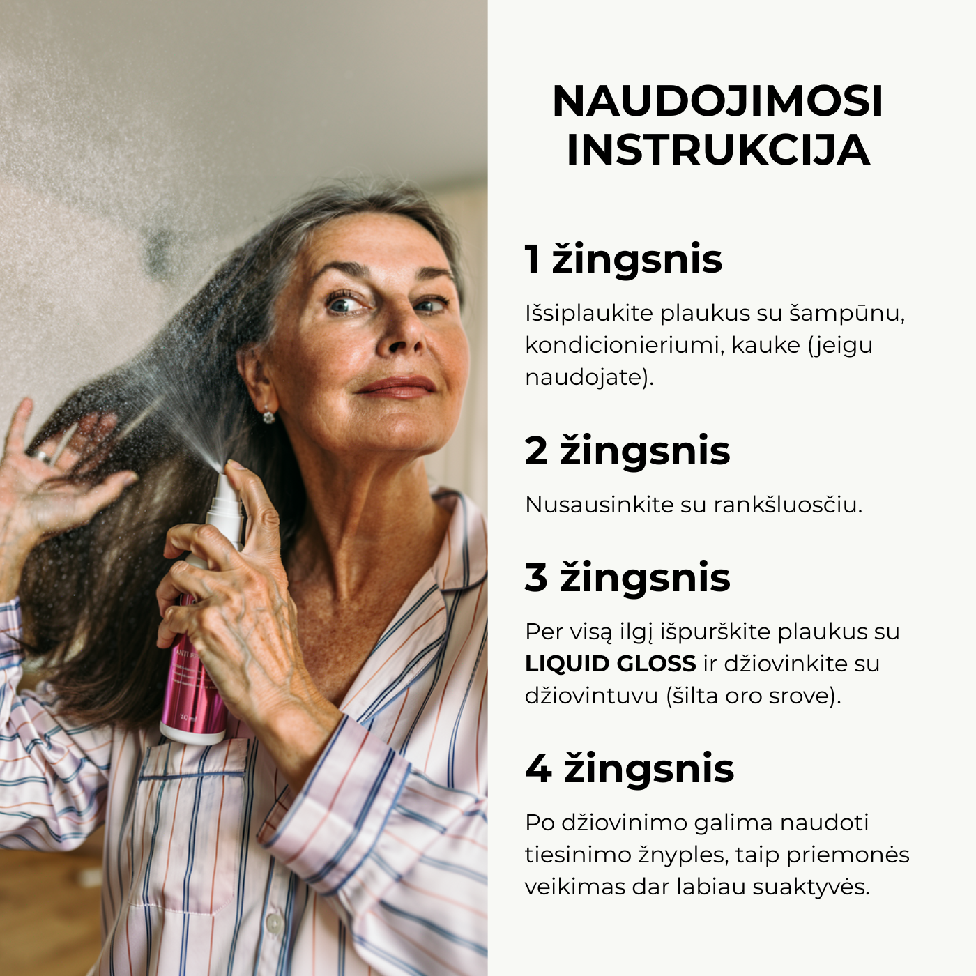 LIQUID GLOSS (150 ml): Plaukite plaukus šampūnu, kondicionuokite ir nusausinkite rankšluosčiu.Padalinkite plaukus į sruogas. Gausiai ir tolygiai purkškite ant drėgnų (ne šlapių) plaukų. Nenaudokite kitų formavimo priemonių, kol plaukai yra drėgni. Po plaukų džiovinimo naudojant „Liquid Gloss” galite naudoti formavimo priemones. Reikia džiovinti plaukus naudojant feną ar kaitinimo žnyples, kad produktas suaktyvėtų. Produktui aktyvinti yra būtina šiluma.